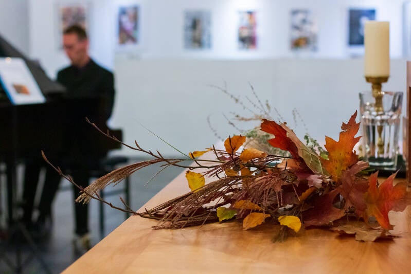 De pianist wat zijn muziek al aan het oefenen.